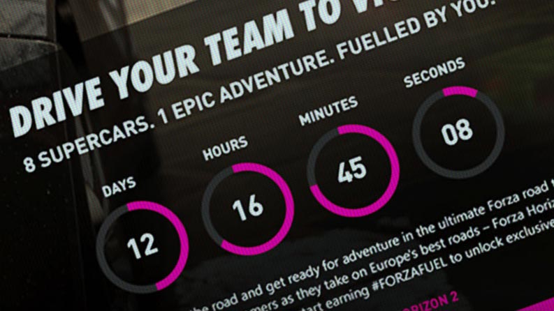 Working alongside Xbox.com, Marketing and 3 external agencies - Jam handing location shoots and all social media, Staak handling website design and VML providing email support. For xbox dashboard it was proposed the experience started as Forza Fuel Team Challenge and prize draw and then would morph into a Forza Horizon 2 launch experience. We had to consider and integrate cross-platform functionality, allowing users to sign up on Xbox One Dash or the Xbox.com website a first on Xbox dashboard. Once a user signed up and chose a team, the UI on the console experience would then change to their colour along with team info, events and stats. Bringing website functionality to a controller-based experience was an amazing challenge that resulted in hugely positive engagement on xbox one dashboard and high user sign ups.